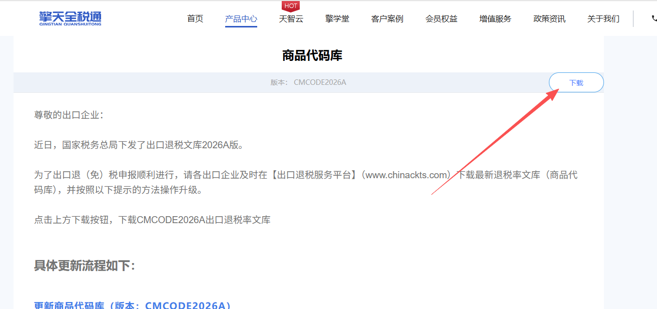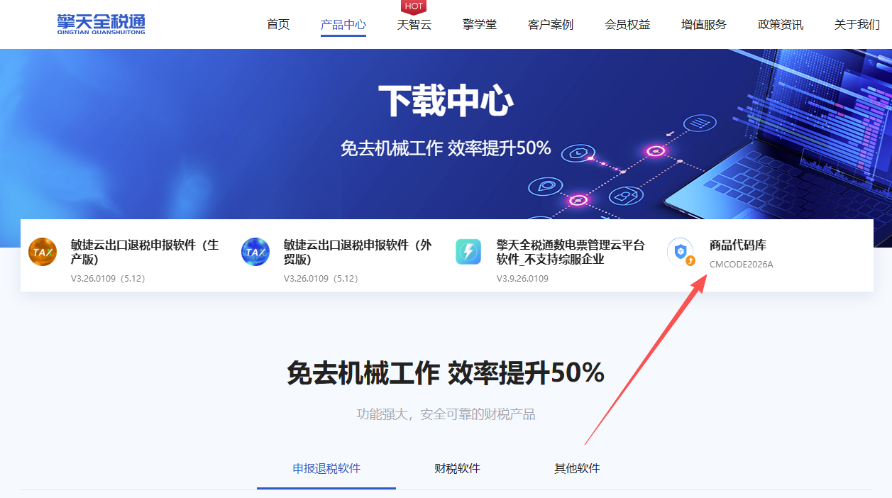 1、登录出口退税服务平台(www.chinackts.com),点击【产品中心】-【下载中心】-【商品代码库】