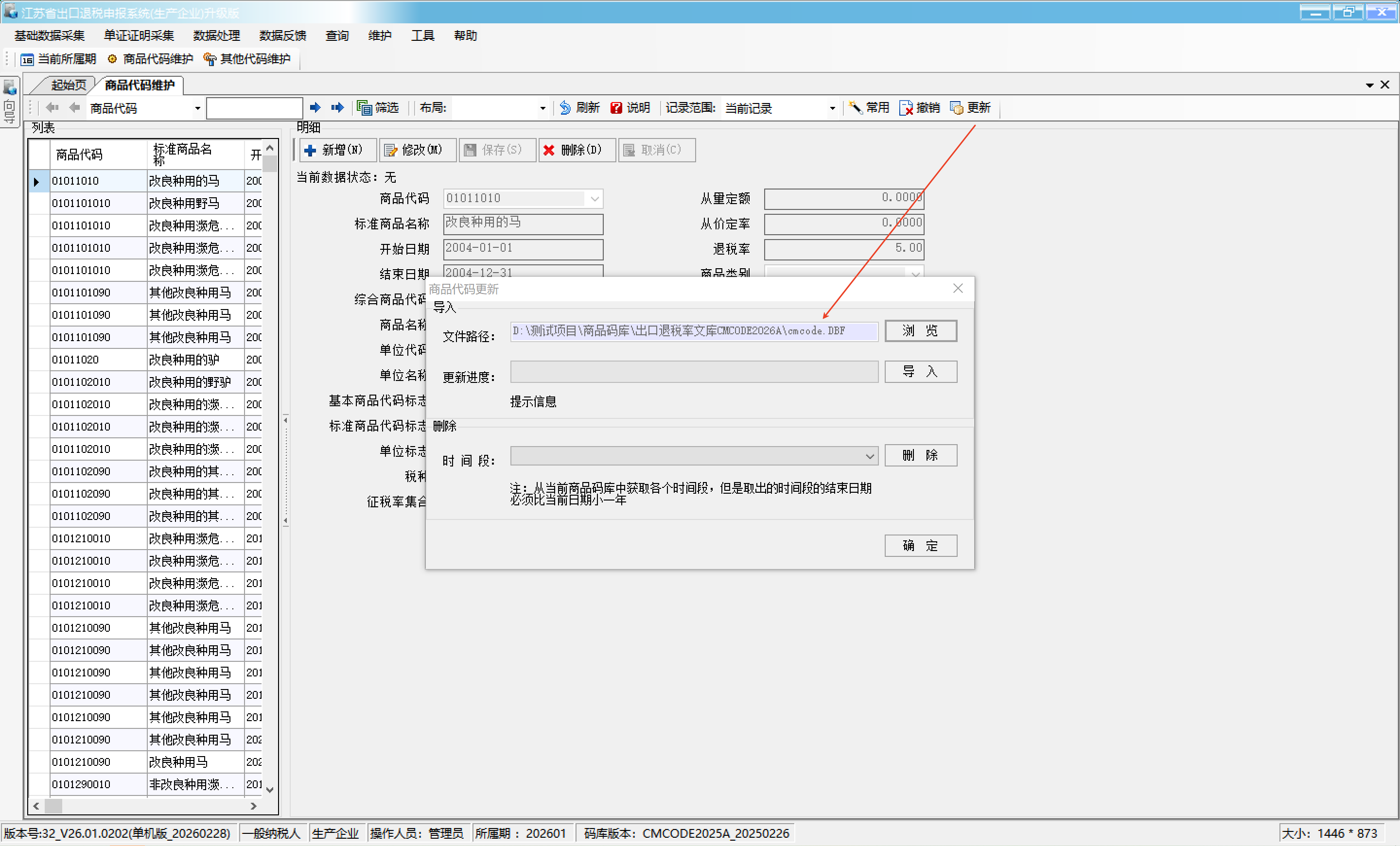2、点击【更新】按钮进行更新,点击【浏览】选择下载的最新版CMCODE2026A的cmcode.dbf文件并点击【导入】