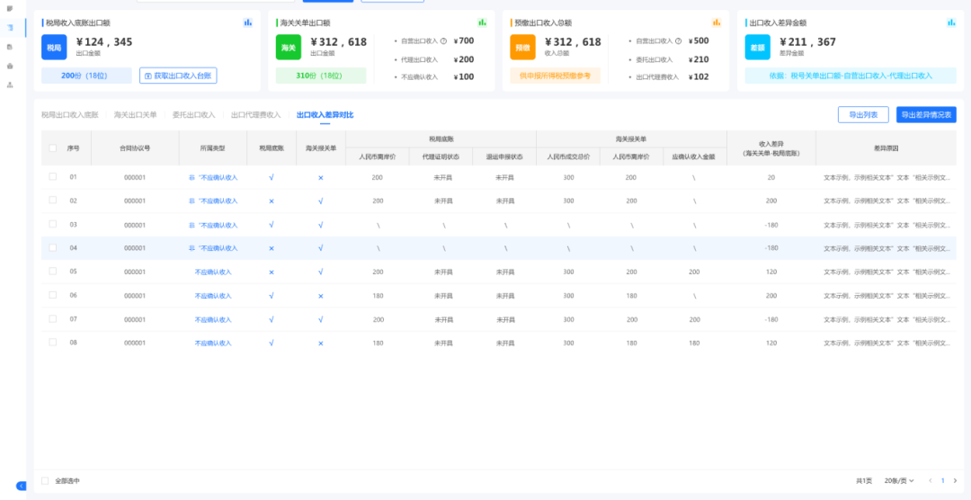 系统自动逐笔比对企业的出口关单确认收入金额和税局统计的出口收入金额,并自动进行差异原因分类。
