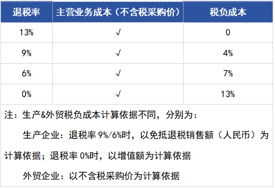 综合涉税影响的分析,我们会发现,从享受全部退税(退税率13%)、享受部分退税(退税率9%、6%)到全额征税(退税率0%),一般贸易出口商品成本结构发生了根本性变化,从而关联经营利润,具体如下: