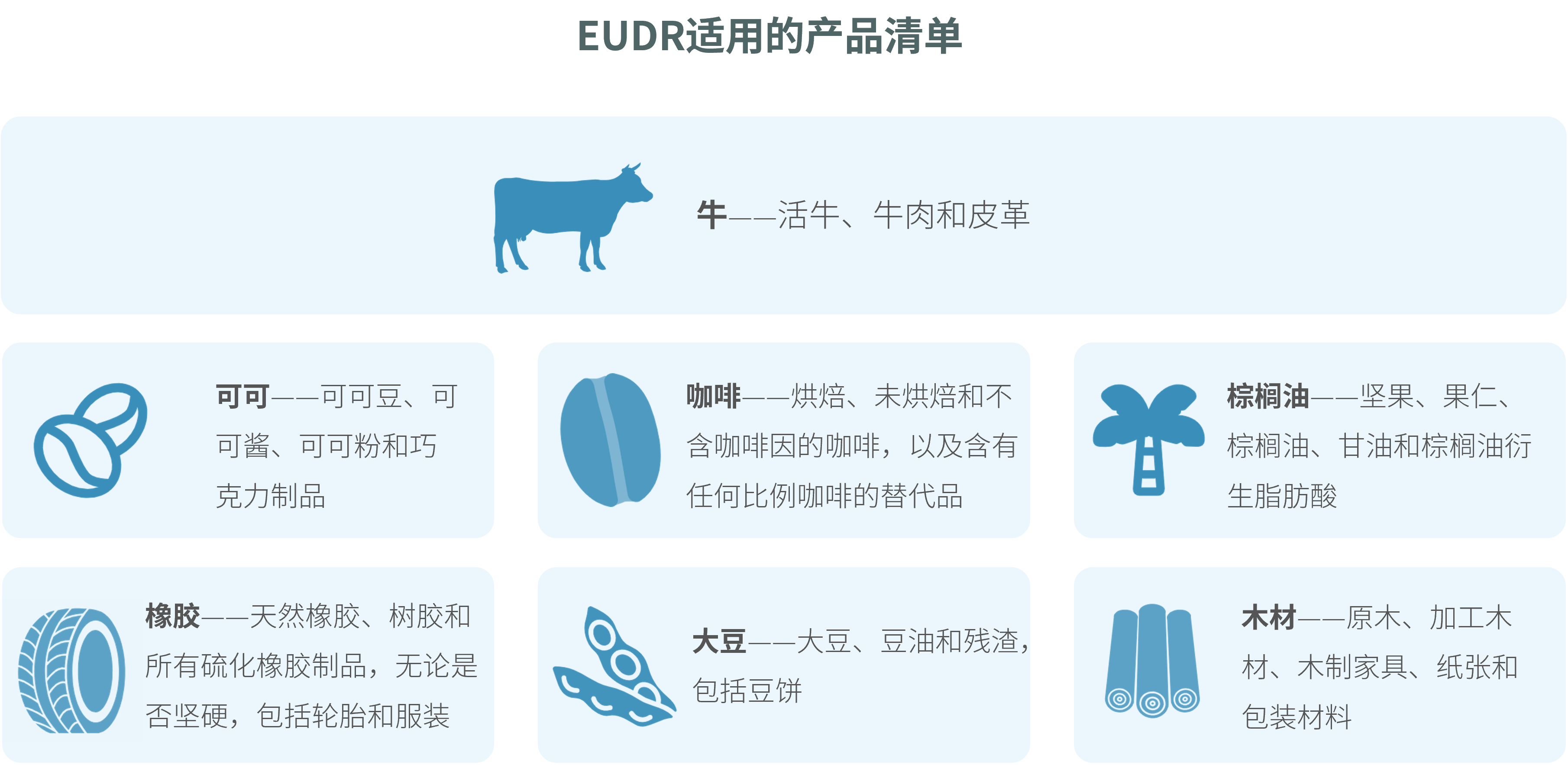 EUDR适用于七类核心商品及其衍生产品:木材、牛肉、棕榈油、大豆、咖啡、可可和橡胶。只要产品涉及这些原料,无论是直接出口还是欧盟境内转售,都必须遵守EUDR规定。