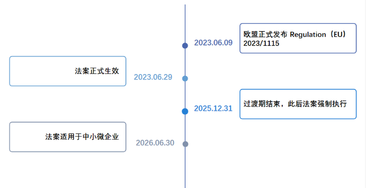 据统计,毁林和森林退化占全球温室气体排放量的11%,是气候变化和生物多样性丧失的主要驱动因素之一。欧盟零毁林法案(EUDR)是欧盟绿色新政的核心组成部分,是出口欧盟市场的强制性新规,旨在解决由农业扩张导致的森林砍伐和退化问题,确保在欧盟市场流通的商品不涉及毁林活动。该法规于2023年6月29日生效,2025年底至2026年中逐步强制执行的欧盟法规。