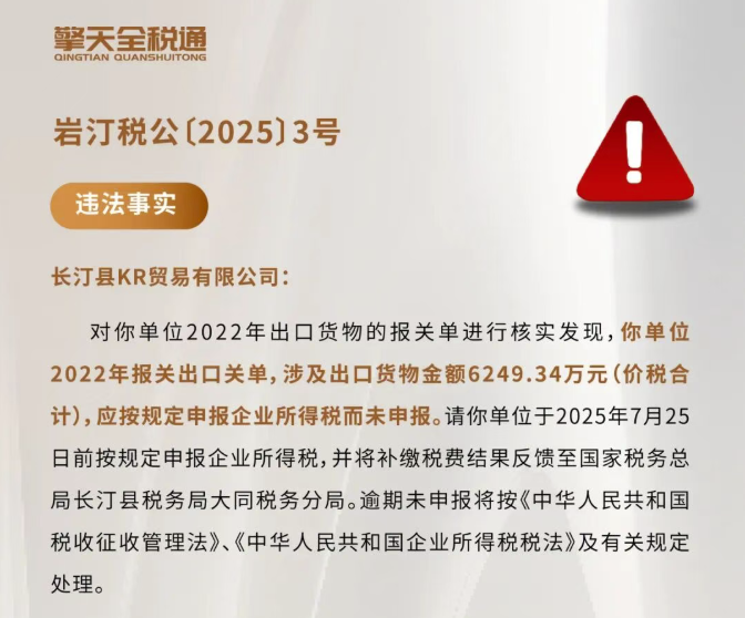 对你单位2022年出口货物的报关单进行核实发现,你单位2022年报关出口关单,涉及出口货物金额6249.34万元(价税合计),应按规定申报企业所得税而未申报。请你单位于2025 年7月25日前按规定申报企业所得税,并将补缴税费结果反馈至国家税务总局长汀县税务局大同税务分局。逾期未申报将按《中华人民共和国税收征收管理法》、《中华人民共和国企业所得税税法》及有关规定处理。