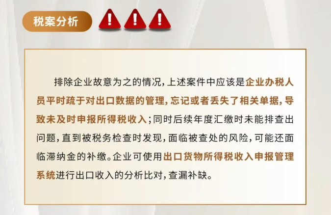 排除企业故意为之的情况,上述案件中应该是企业办税人员平时疏于对出口数据的管理,忘记或者丢失了相关单据,导致未及时申报所得税收入;同时后续年度汇缴时未能排查出问题,直到被税务检查时发现,面临被查处的风险,可能还面临滞纳金的补缴。