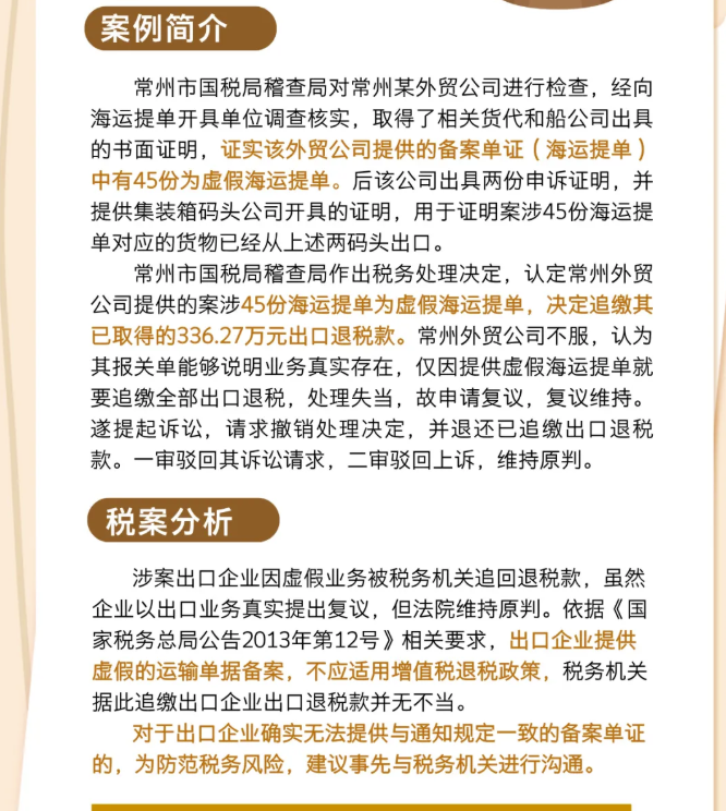 常州市国税局稽查局于2015年5月作出税务处理决定,认定常州外贸公司提供的案涉45份海运提单为虚假海运提单,决定追缴其已取得的336.27万元出口退税款。常州外贸公司不服,认为其报关单能够说明业务真实存在,仅因提供虚假海运提单就要追缴全部出口退税,处理失当,故申请复议,复议维持。遂提起诉讼,请求撤销处理决定,并退还已追缴出口退税款。一审驳回其诉讼请求,二审驳回上诉,维持原判。