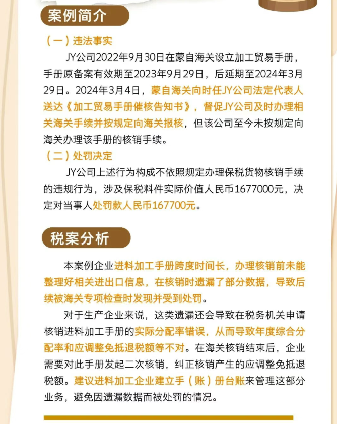 本案例中企业使用的进料加工手册跨度时间长,在办理进料加工手册核销前未能整理好相关的进出口信息,在核销时遗漏了部分数据,导致后续被海关专项检查时发现并受到处罚。