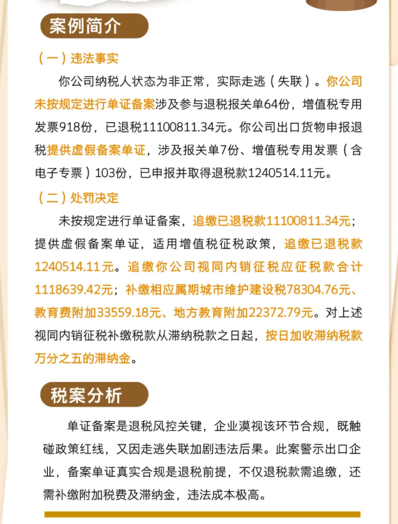 单证备案是退税风控关键,企业漠视该环节合规,既触碰政策红线,又因走逃失联加剧违法后果。此案警示出口企业,备案单证真实合规是退税前提,不仅退税款需追缴,还需补缴附加税费及滞纳金,违法成本极高。