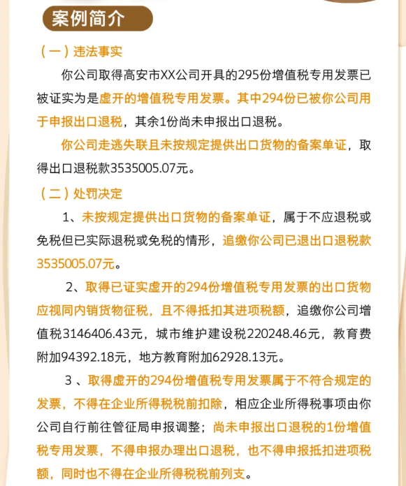 (一)你公司取得高安市XX公司开具的295份增值税专用发票(金额27280481.21元,税额3546462.39元,价税合计30826943.6元),已被证实为是虚开的增值税专用发票。其中294份已被你公司用于申报出口退税(金额27192348.11元,税额3535005.09元),其余1份(金额88133.1元,税额11457.3元)尚未申报出口退税。
