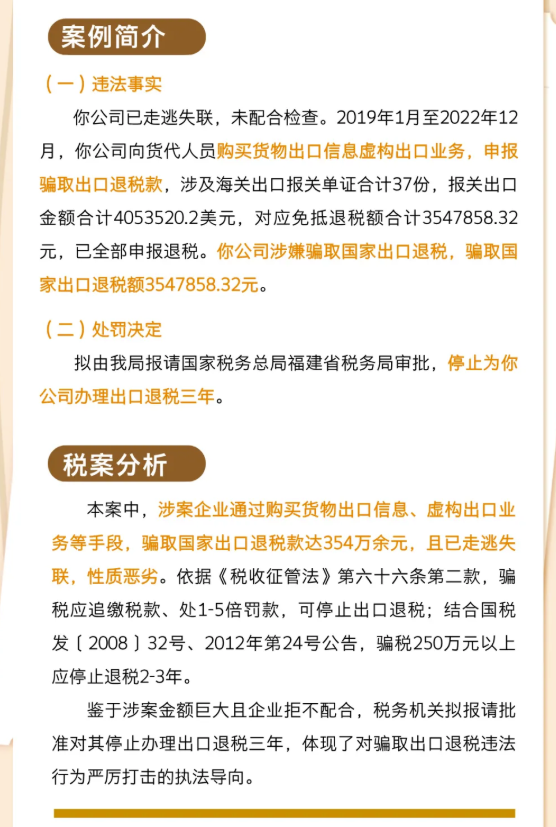 根据《中华人民共和国税收征收管理法》第六十六条第二款、《国家税务总局关于停止为骗取出口退税企业办理出口退税有关问题的通知》(国税发〔2008〕32号)第一条和《国家税务总局关于发布<出口货物劳务增值税和消费税管理办法>的公告》(国家税务总局公告2012年第24号)第十三条第六项第3目、第5目规定,拟由我局报请国家税务总局福建省税务局审批,停止为你公司办理出口退税三年。