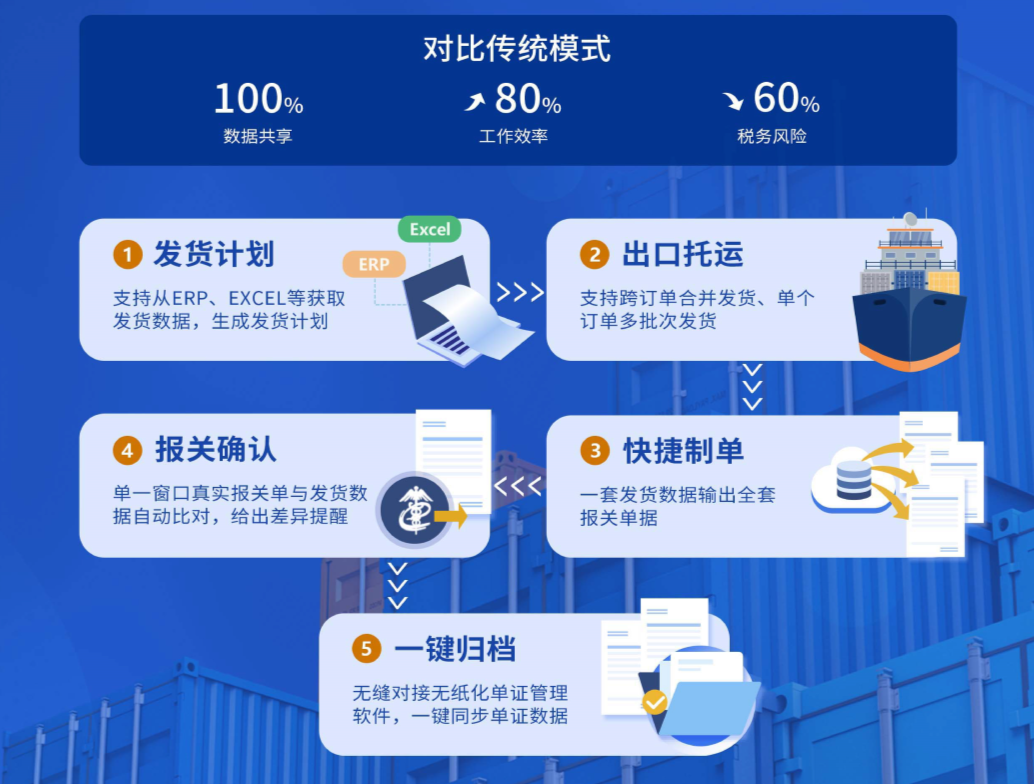 关贸宝软件是一款服务于外贸出运场景中关务合规化的轻量级SAAS,可打通企业ERP系统,自动读取采集到的报关单数据,自动匹配单证及出运数据,实现发货单、出口单证、报关单等全流程数据统一,帮助企业规范出口流程、规避关务和税务风险,实现关务+业财税协同一体化。
