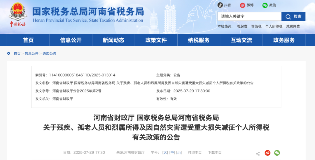 河南税务局发布《关于残疾、孤老人员和烈属所得及因自然灾害遭受重大损失减征个人所得税有关政策的公告》。