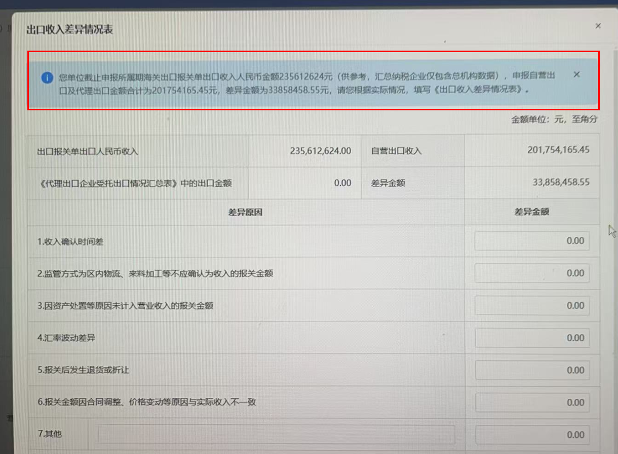 有出口企业在填写自营出口收入后提示“申报自营出口收入与出口报关单出口收入人民币金额不一致”。