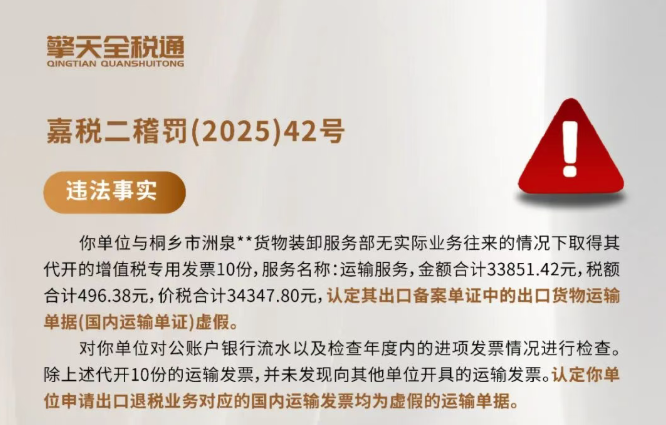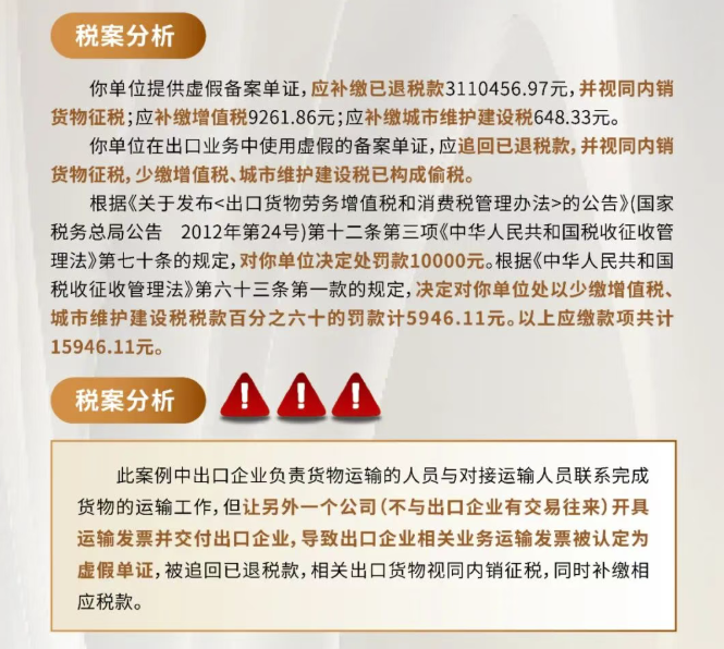 此案例中出口企业负责货物运输的人员与对接运输人员联系完成货物的运输工作,但让另外一个公司(不与出口企业有交易往来)开具运输发票并交付出口企业,导致出口企业相关业务运输发票被认定为虚假单证,被追回已退税款,相关出口货物视同内销征税,同时补缴相应税款。
